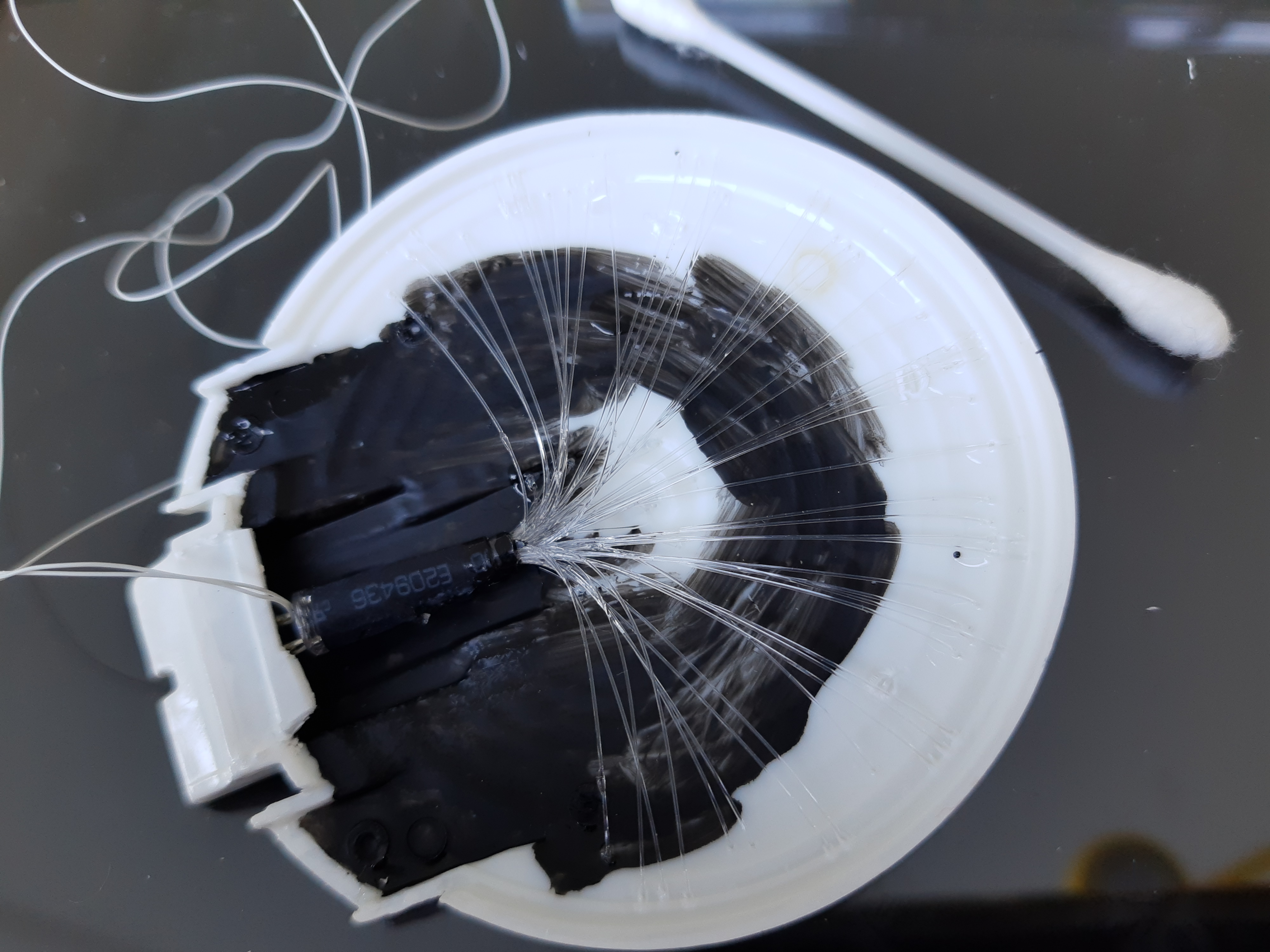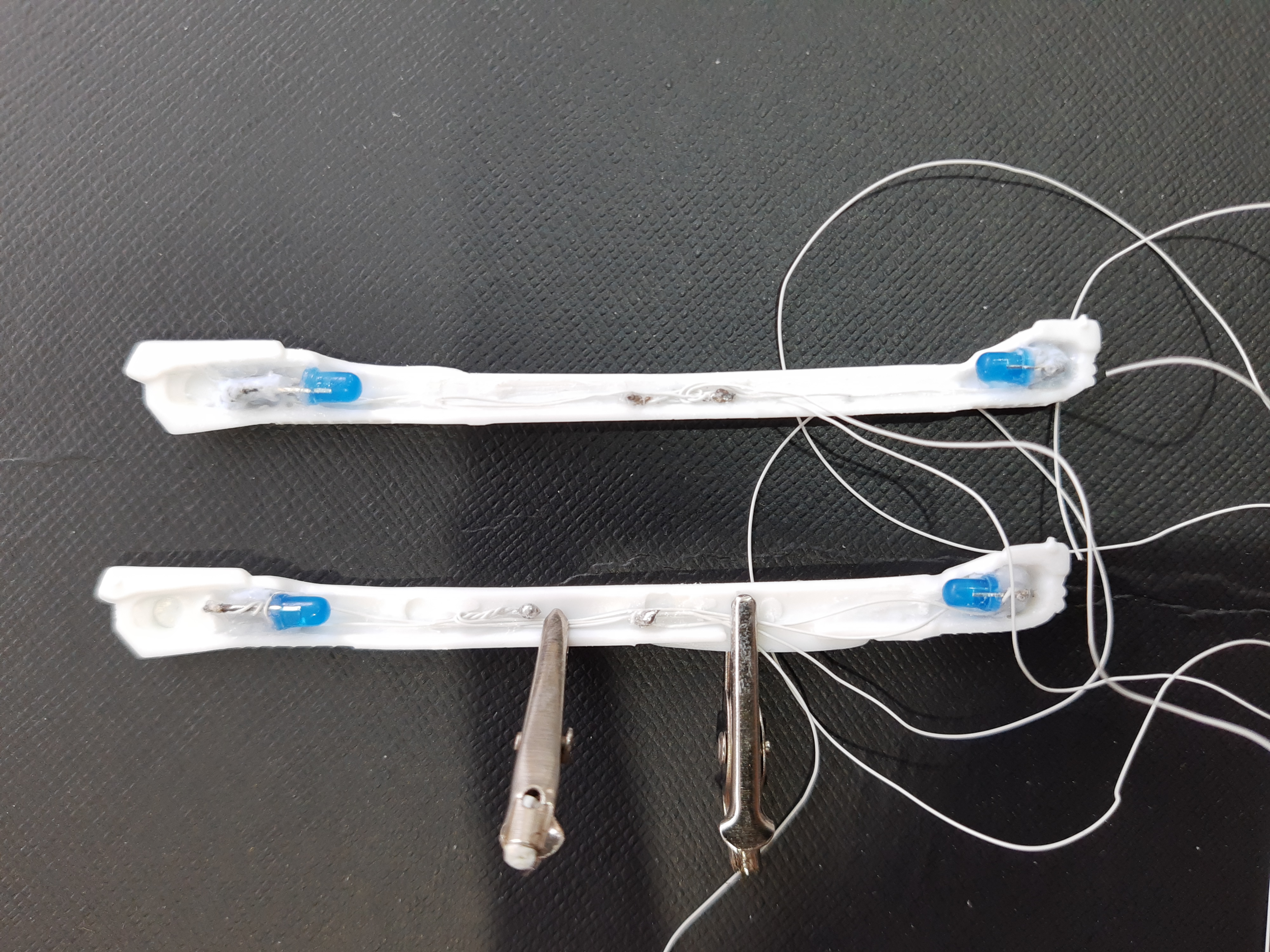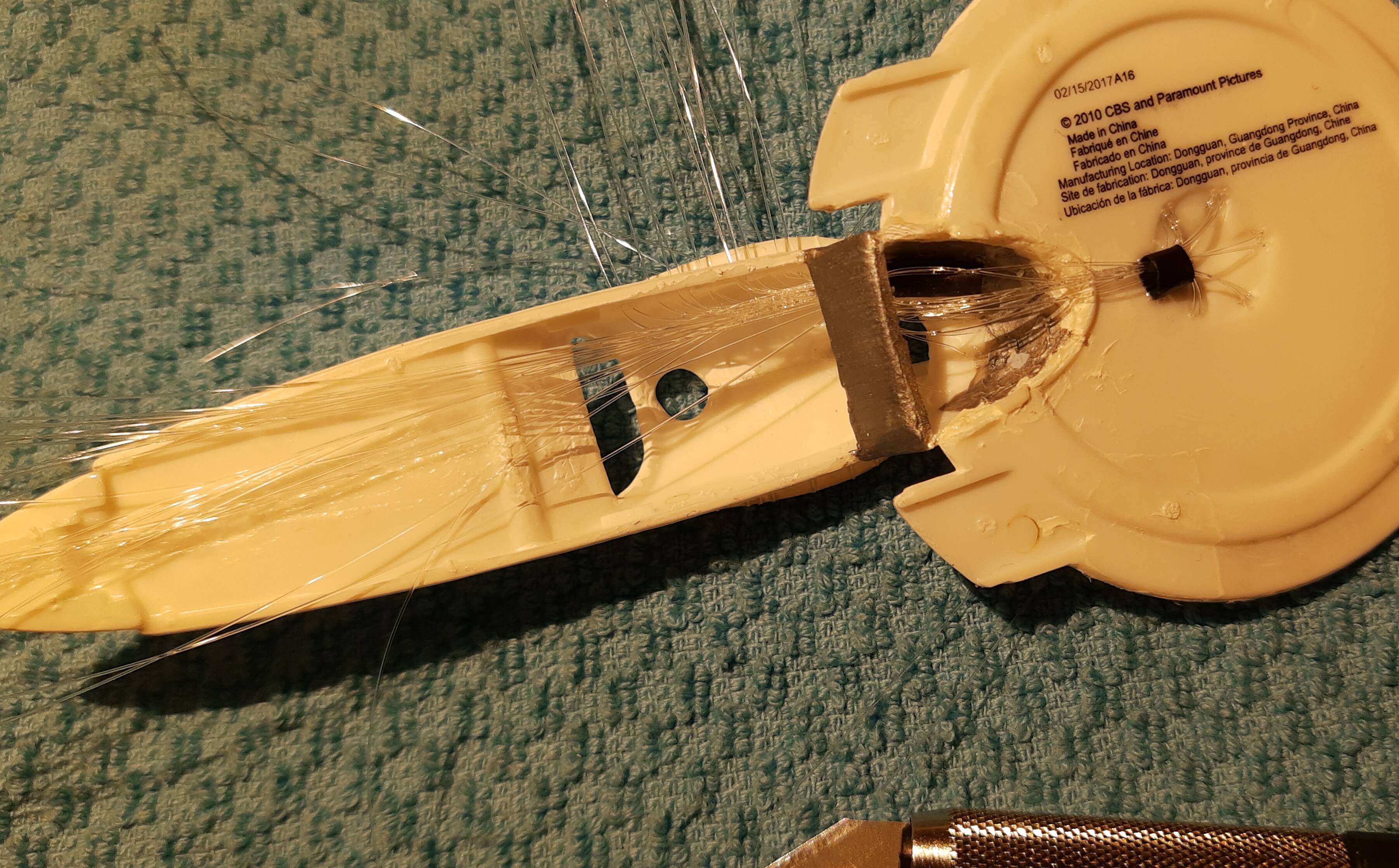 As seen above, the original model had opaque nacelles. I cut them, with the hope of finding semi-transparent plastic I could apply later, and began adding blue LEDs. I also had to design how to wire very thin cables in a tidy way, without disrupting the future application of the decals. The working space was very narrow: