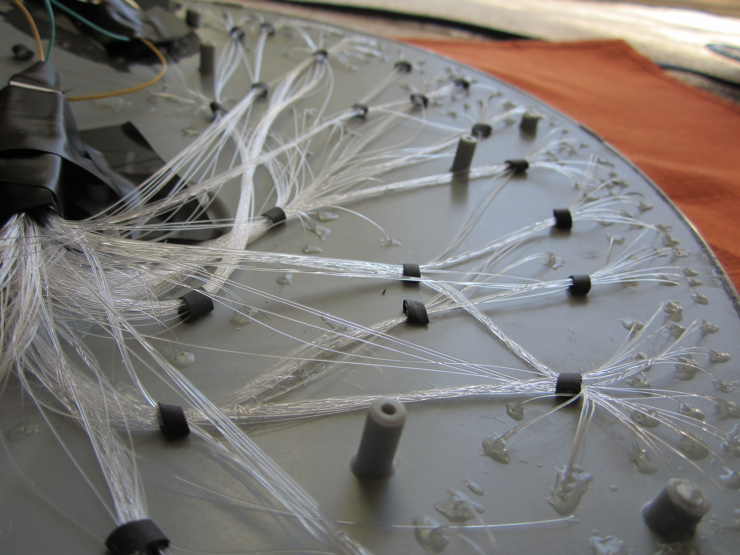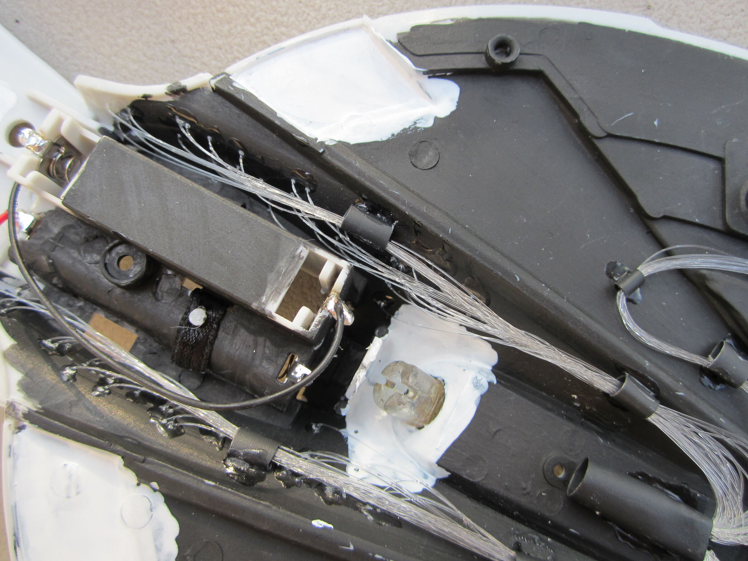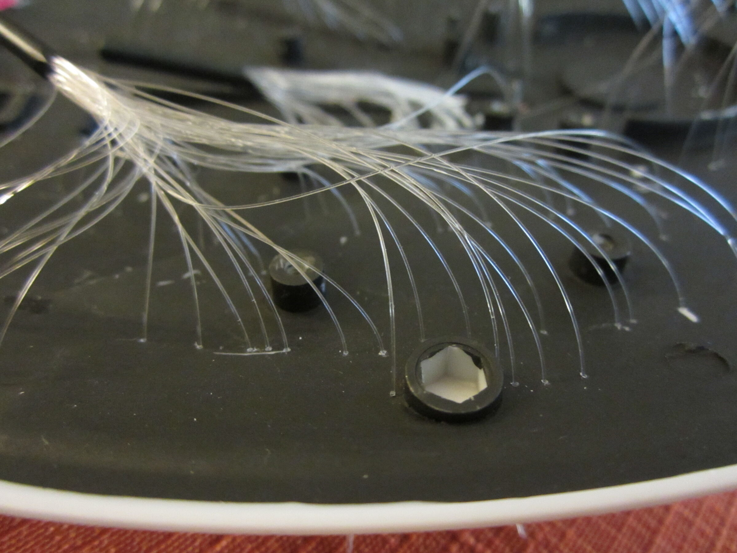 Next, I drilled tiny holes where the windows were supposed to be using a 0.3 mm drill bit. This painstaking task resulted in about 380 “windows” for the ship (and many, many broken drills). I used six cables in total, each consisting of 64 strands. I also used 3mm and 5mm fibers, such as the row of four yellow lights at the front of the ship, which was not part of the original model but a creative addition.