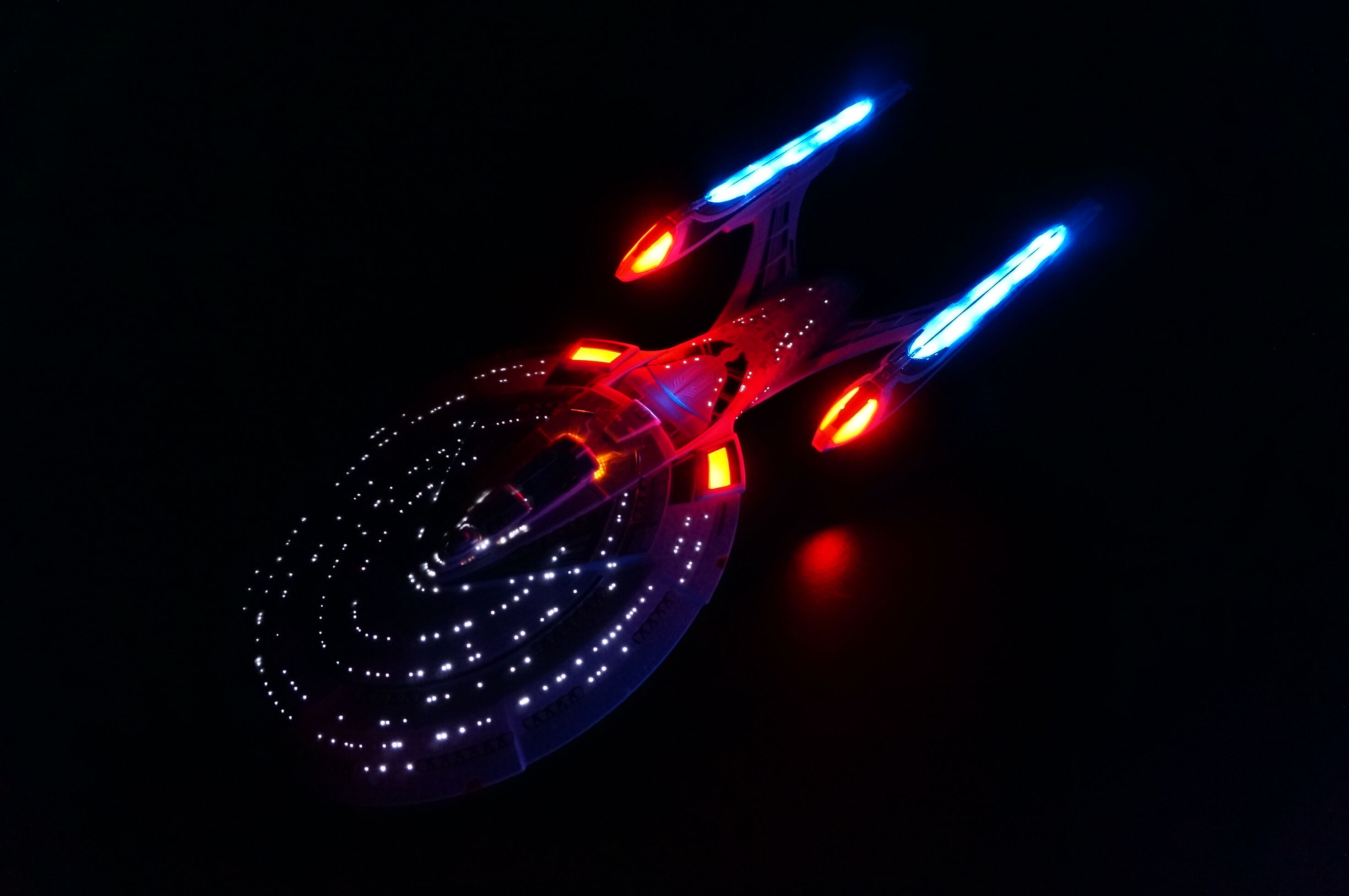 In 2014, I embarked on my first model-making adventure, diving into a hobby that had always intrigued me: adding LEDs and fiber optics to models. I chose starships as my starting point, inspired by my love for the Star Trek franchise, particularly The Next Generation. The starships from this series are iconic, brimming with lights and intricate details, making them perfect candidates for my exploration into illuminated models.